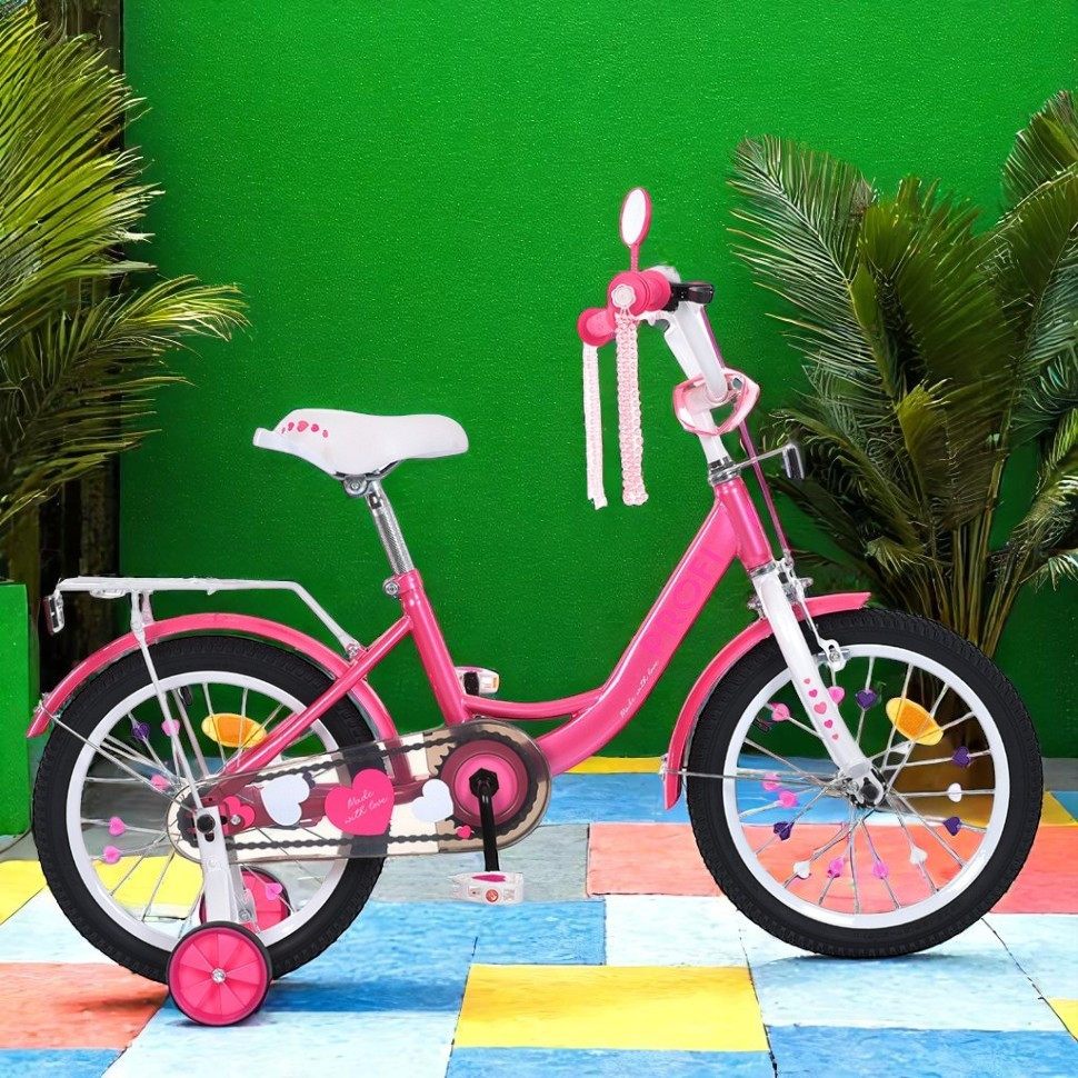 Дитячий двоколісний велосипед 16 дюймів із дзвінком і дзеркалом Profi PRINCES MB 16041 Рожевий Дитячий велосипед MB 16041 PRINCESS, 16 дюймів - це не просто іграшка, це можливість для вашої маленької модниці відчути себе стильною та незалежною. Поєднання стильного дизайну і легкого управління робить цей велосипед ідеальним подарунком для маленьких дівчаток, які тільки починають своє знайомство зі світом двоколісних пригод. Велосипед дитячий MB 16041 - не тільки тішить око своїм яскравим дизайном, а й має міцну сталеву раму, що забезпечує надійність і безпеку під час катання. Двоколісний велосипед MB 16041 - оснащений зручним сидінням з регульованою висотою, що дає змогу підлаштувати його під зріст дитини. М'яка накладка на кермі і ковзаючі ручки забезпечують комфорт і впевнений хват під час поїздок.